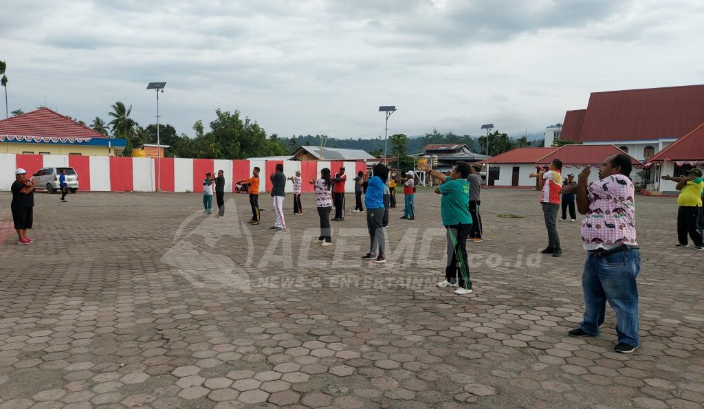 Sebelumnya apel Jumat pagi, diawali dengan jalan sehat mengambil start dan finish di halaman Kantor Bupati, kemudian dilanjutkan dengan senam bersama. (ACM)
