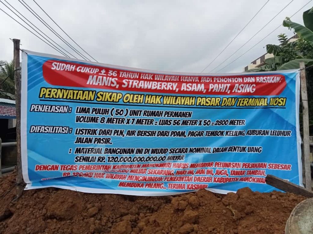 Sejak Rabu (4/10/2023) pagi, masyarakat pemilik hak ulayat pasar dan terminal wosi telah memblokade seluruh akses jalan menunju pasar dan terminal Wosi dengan menggunakan material tanah/pasir dan memasang spanduk tuntutan di beberapa titik akses jalan menuju Pasar Wosi.