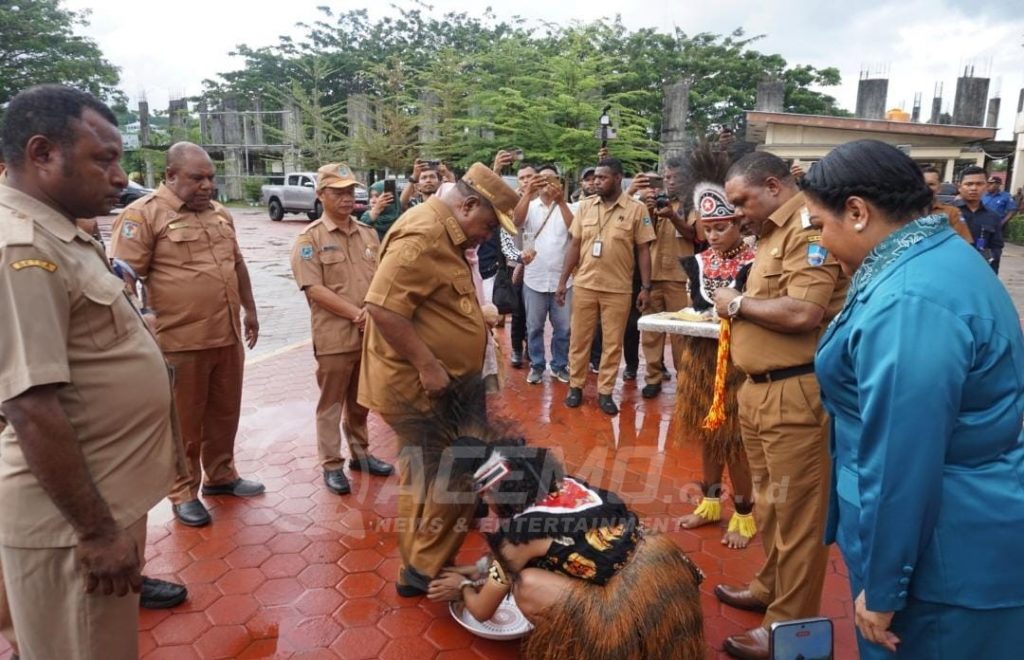 Penyambutan dilakukan dengan tradisi adat injak piring, pengalungan kalung manik, pengalungan noken dan tari tumbuk tanah.