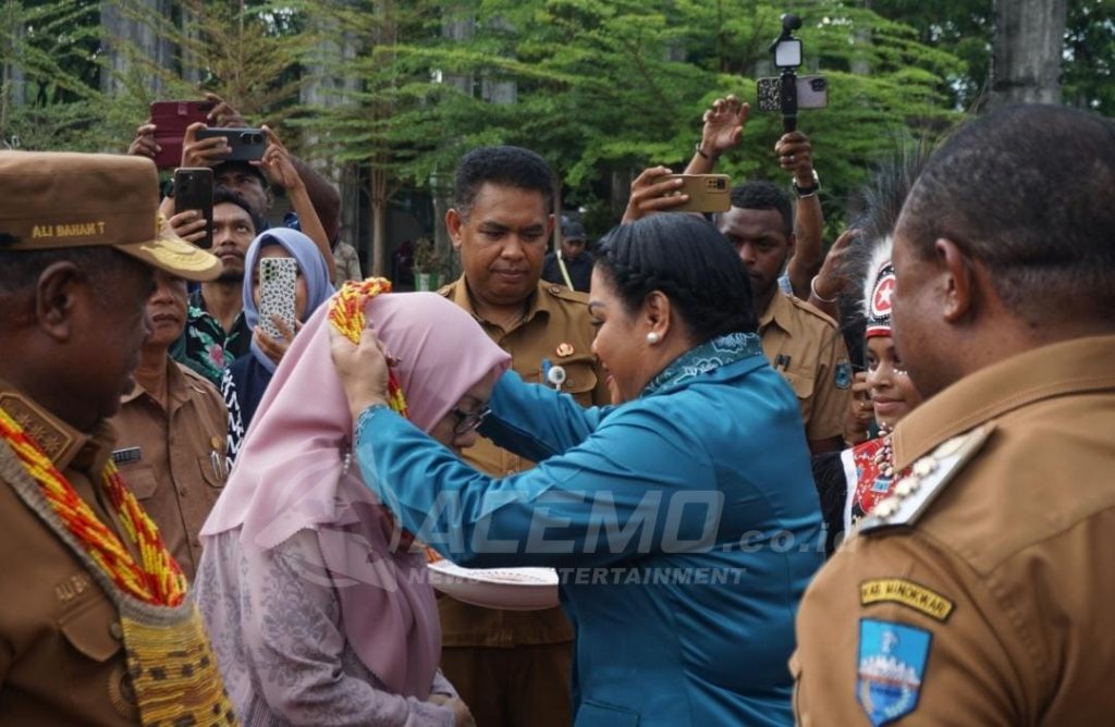 Pengalungan manik dan noken langsung dilakukan oleh Bupati Manokwari Hermus Indou bersama Ketua TP PKK Kabupaten Manokwari Ny. Febelina Indou. Turut hadir Kepala Pengadilan Negeri, Waka Polresta Manokwari, Kepala Fasharkan TNI AL Manokwari, Perwakilan Kejaksaan Negeri Manokwari, Sekda Manokwari beserta jajaran Pimpinan OPD.