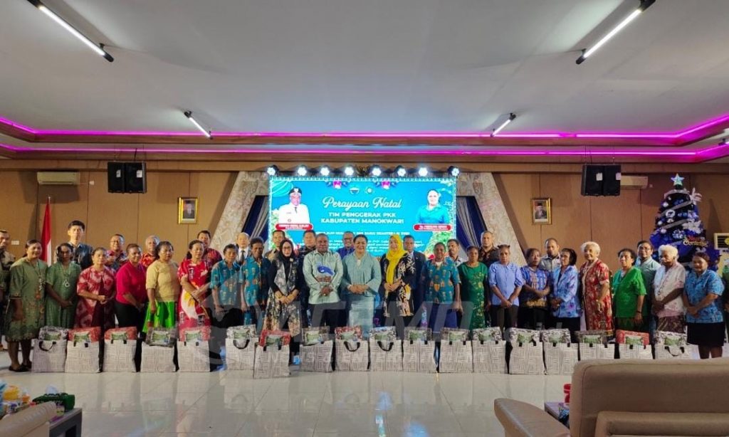 MANOKWARI – Tim Penggerak PKK Kabupaten Manokwari menggelar Natal bersama anggota dengan mengusung tema “Kemuliaan Bagi Allah dan Damai Sejahtera di Bumi”, yang juga menunjukan toleransi beragama di Manokwari. Kegiatan yang berlangsung di salah satu Kantor DPD PWKI Papua Barat, (7/12/2023).