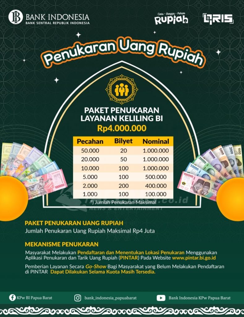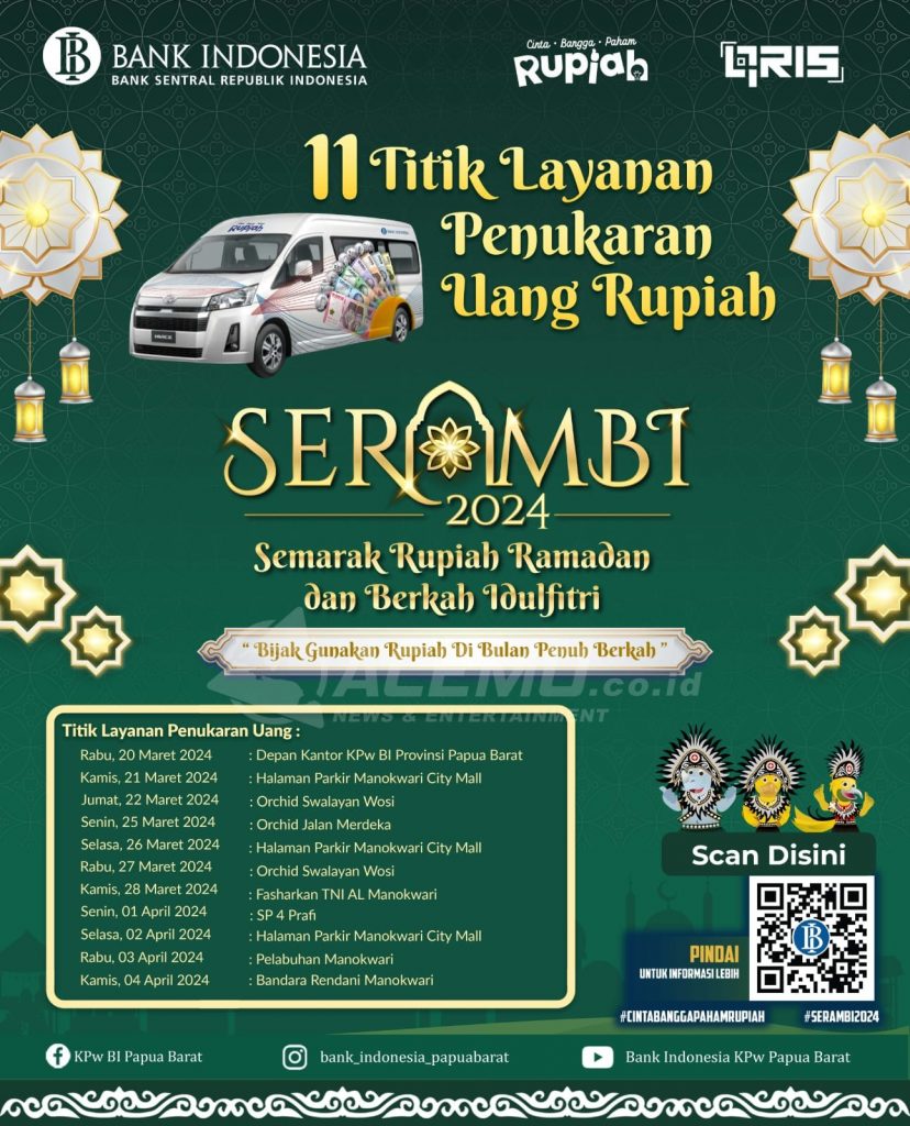 Kemudian layanan kas keliling reguler di fasilitas publik seperti di pusat keramaian, serta layanan kas peduli mudik di Pelabuhan Manokwari dan Bandara Rendani dengan jadwal yang akan kami sampaikan melalui kanal media sosial Bank Indonesia.