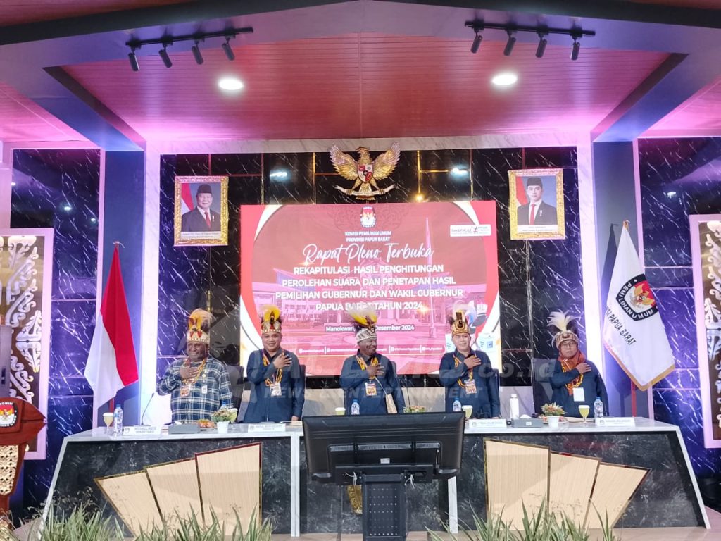 MANOKWARI – Komisi Pemilihan Umum (KPU) Provinsi Papua Barat menggelar rapat pleno terbuka rekapitulasi hasil penghitungan perolehan suara dan penetapan hasil pemilihan Gubernur dan Wakil Gubernur Papua Barat tahun 2024, Minggu ( 8/12/2024) sore.
