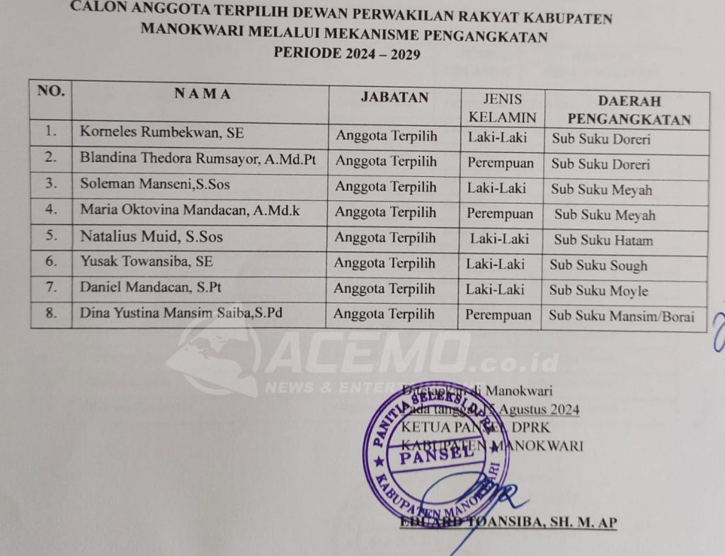 MANOKWARI – Panitia seleksi (pansel) anggota DPRK Manokwari jalur pengangkatan telah mengumumkan 8 nama calon anggota terpilih Dewan Perwakilan Rakyat Kabupaten (DPRK) periode 2024-2029, Selasa (20/8/2024).