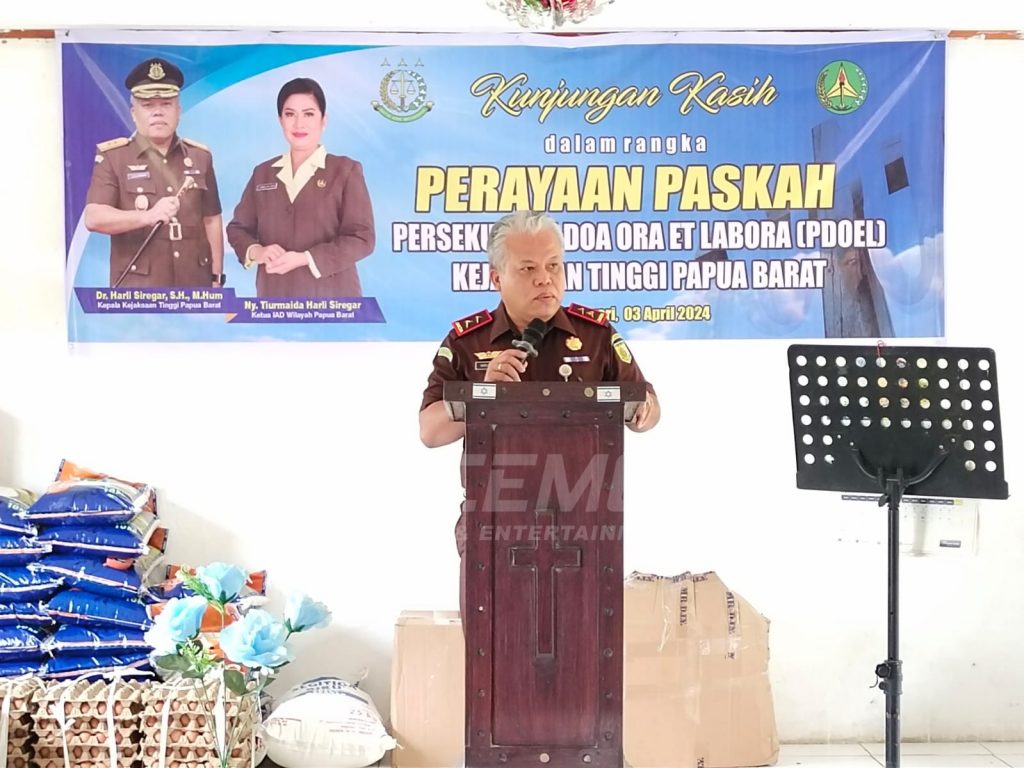 MANOKWARI – Kunjungan kasih Kepala Kejaksaan Tinggi Papua Barat beserta jajaran di Panti Asuhan Kristen Fajar Timur dalam perayaan Paskah bersama Persekutuan Doa Ora ET Labora (PDOEL) Kejati Papua Barat, Rabu (3/4/2024).